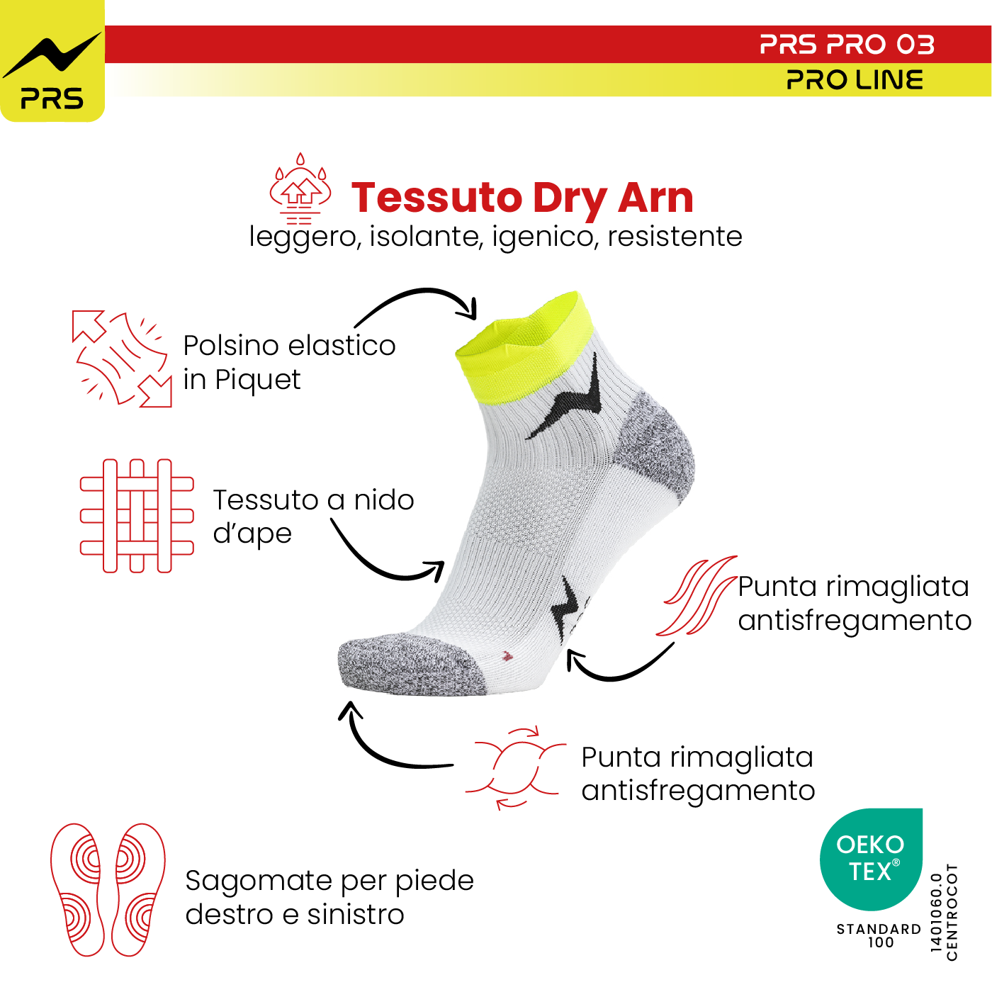 Attraversa la linea del traguardo dell'eccellenza con le calze PRS PRO 03, dove comfort senza compromessi e prestazioni di livello si incontrano a ogni passo della tua corsa